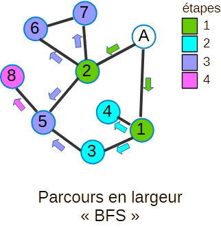 Aussi appelé BFS (Breadth-First Search), le parcours en largeur explore un graphe à partir d’un sommet A donné, en s’éloignant progressivement de A. Plus précisément, il consiste à explorer d’abord tous les voisins de A, puis les voisins de chacun de ces voisins (qui n’ont pas encore été visités), et ainsi de suite.