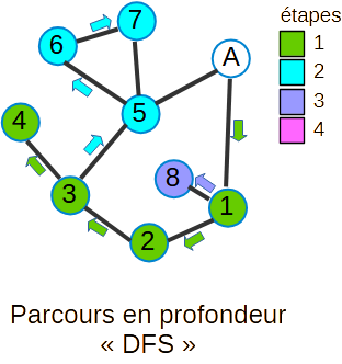 Aussi appelé DFS (Depth-First Search), le parcours en profondeur explore un graphe en suivant chaque chemin le plus loin possible puis, lorsqu’il rencontre un « cul de sac » (un sommet qui n’a d’arcs que vers des sommets déjà visités), revient en arrière vers le sommet précédent disposant d’arcs non-visités, et recommence.