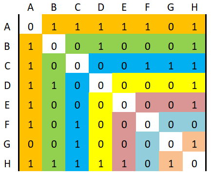 On constate bien à l'aide des couleurs que l'on retrouve en colonne ce que l'on a en ligne. La matrice est donc bien symétrique .