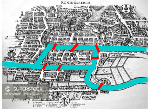 La ville de Königsberg (aujourd'hui Kaliningrad, en Russie) est construite autour de deux îles situées sur le Pregel et reliées entre elles par un pont. Six autres ponts relient les rives de la rivière à l'une ou l'autre des deux îles, comme représentés sur le plan ci-dessous.